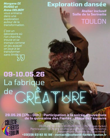 Inscriptions atelier Voguing gratuites (Nombre de places limité) : +33(0)6 63 82 91 98 - contact@collectif-fiertes-toulon.fr ou sur les réseaux du Laboratoire NioFar